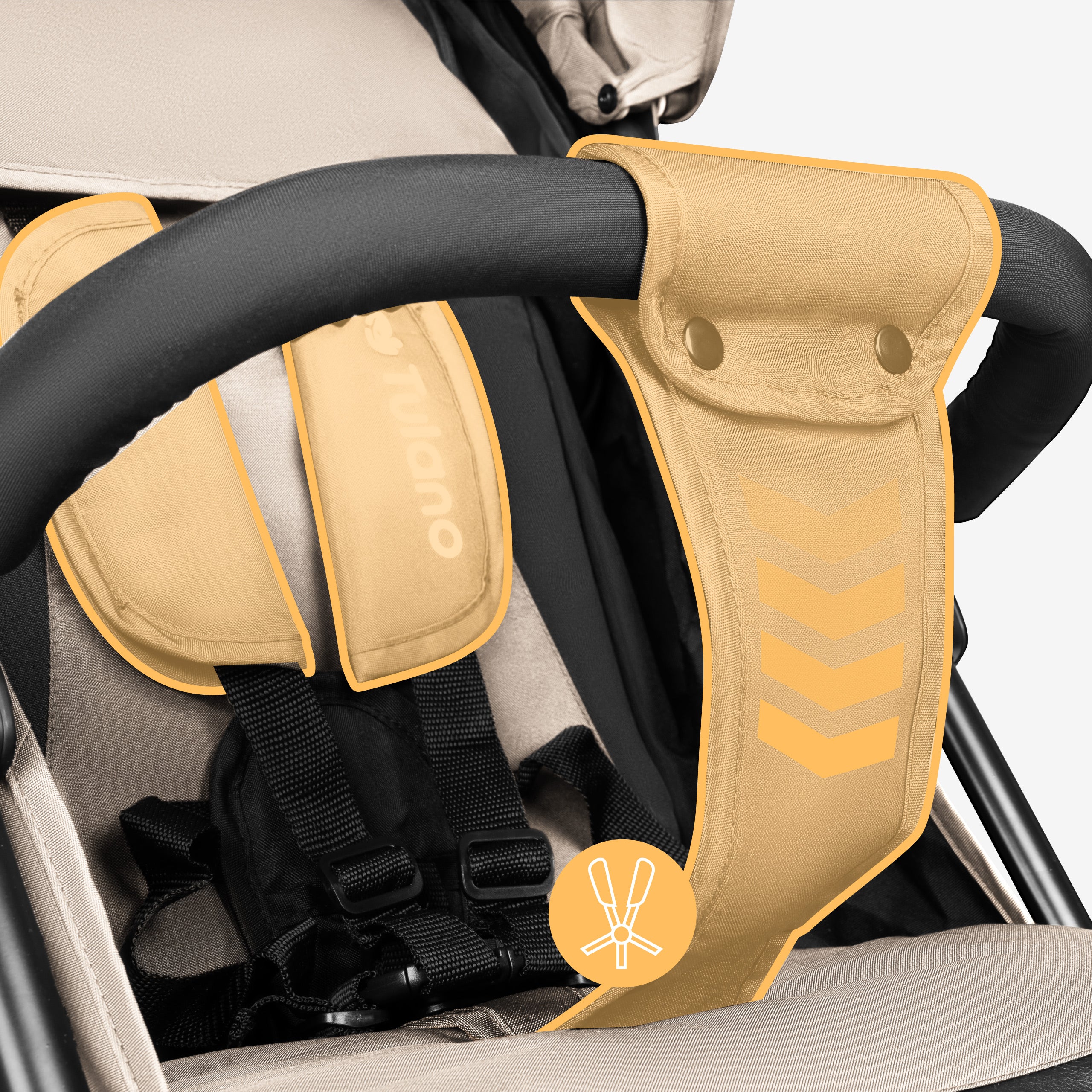 Der Davos-Kinderwagen ist ausgestattet mit5-Punkt-Sicherheitsgurtemit weichen Protektoren und einem abnehmbaren Geländer mit Schrittgurt.